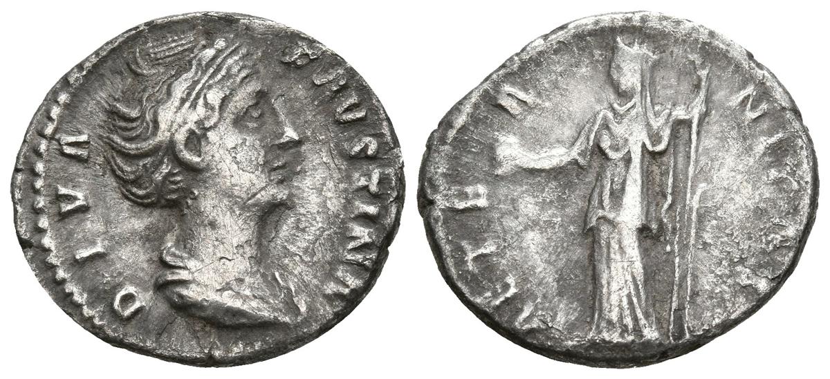 FAUSTINA I. Denario. (Ar. 3,14g/18mm). 141 d.C. Roma. (RIC 344). Anv: Busto diademado y drapeado de Faustina I a derecha, alrededor leyenda: DIVA FAVSTINA. Rev: Aeternitas estante mirando a izquierda portando patera y cetro, alrededor leyenda: AETERNITAS. MBC.