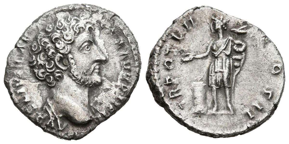MARCO AURELIO. Denario. (Ar. 3,19g/18mm). 152-153 d.C. Roma. (RIC 458). Anv: Cabeza de Marco Aurelio a derecha, alrededor leyenda: AVRELIVS CAESAR AVG PII FIL. Rev: Genio estante a izquierda portando patera sobre altar y águila legionaria, alrededor leyenda: TR POT VII COS II. MBC+.