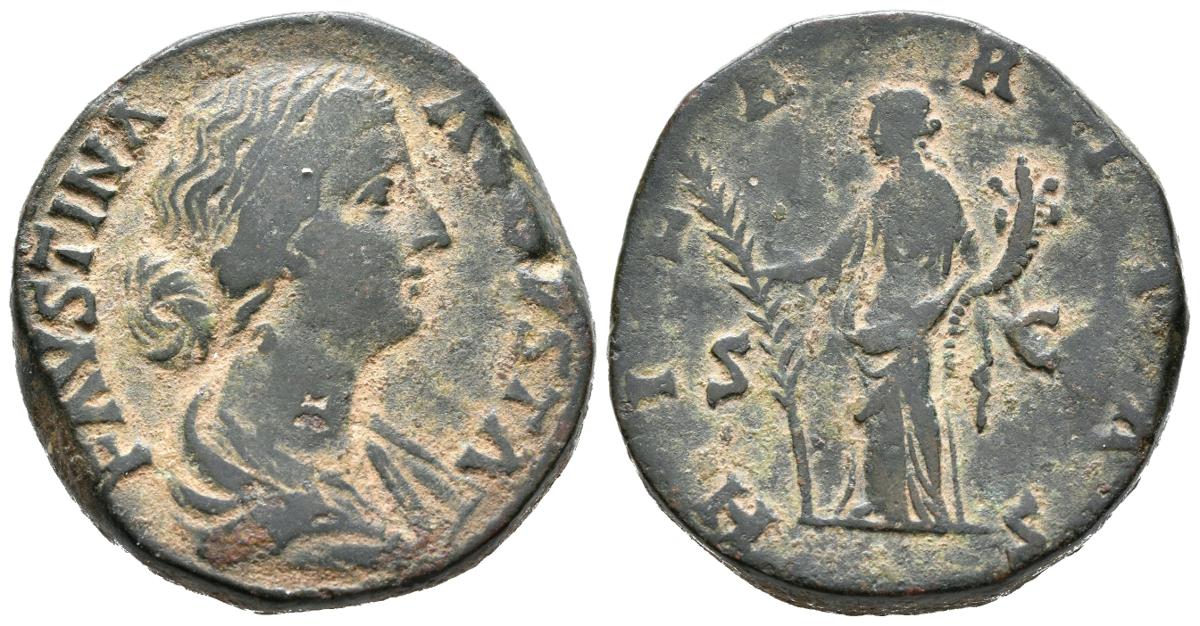 FAUSTINA II. Sestercio. (Ae. 23,50g/24mm). 161-176 d.C. Roma. (RIC 1642). Anv: Busto diademado y drapeado de Faustina II a derecha, alrededor leyenda: FAVSTINA AVGVSTA. Rev: Hilaritas estante a izquierda portando palma y cornucopia, entre: S-C, alrededor leyenda: HILARITAS. MBC-.