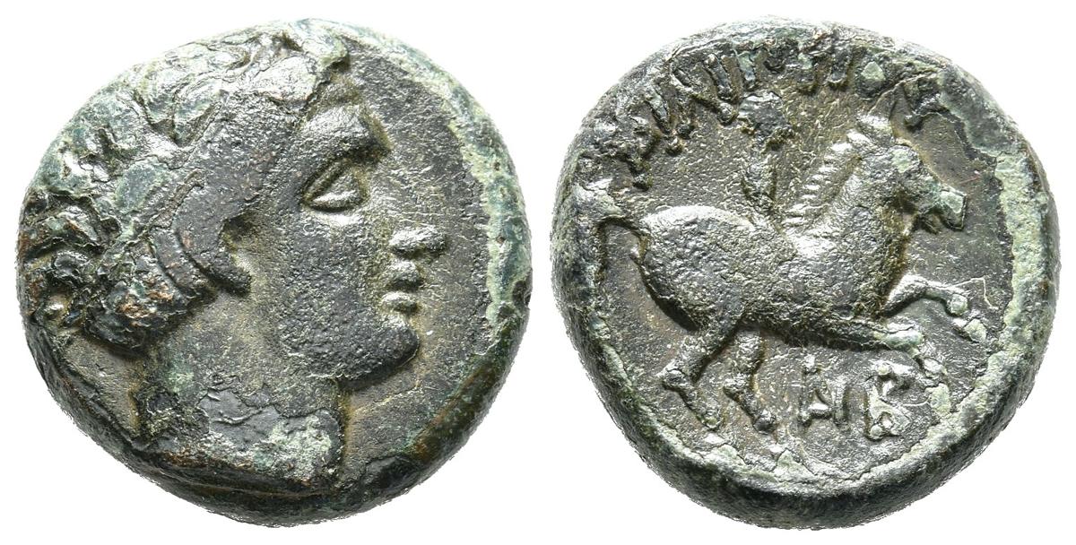 REYES DE MACEDONIA, Filipo II. Ae16. (Ae. 5,54g/16mm). 323-315 a.C. Macedonia. (SNG Ans 905). Anv: Cabeza laureada de Apolo a derecha. Rev: Jinete sobre caballo a derecha, encima leyenda griega, debajo letras griegas. MBC.