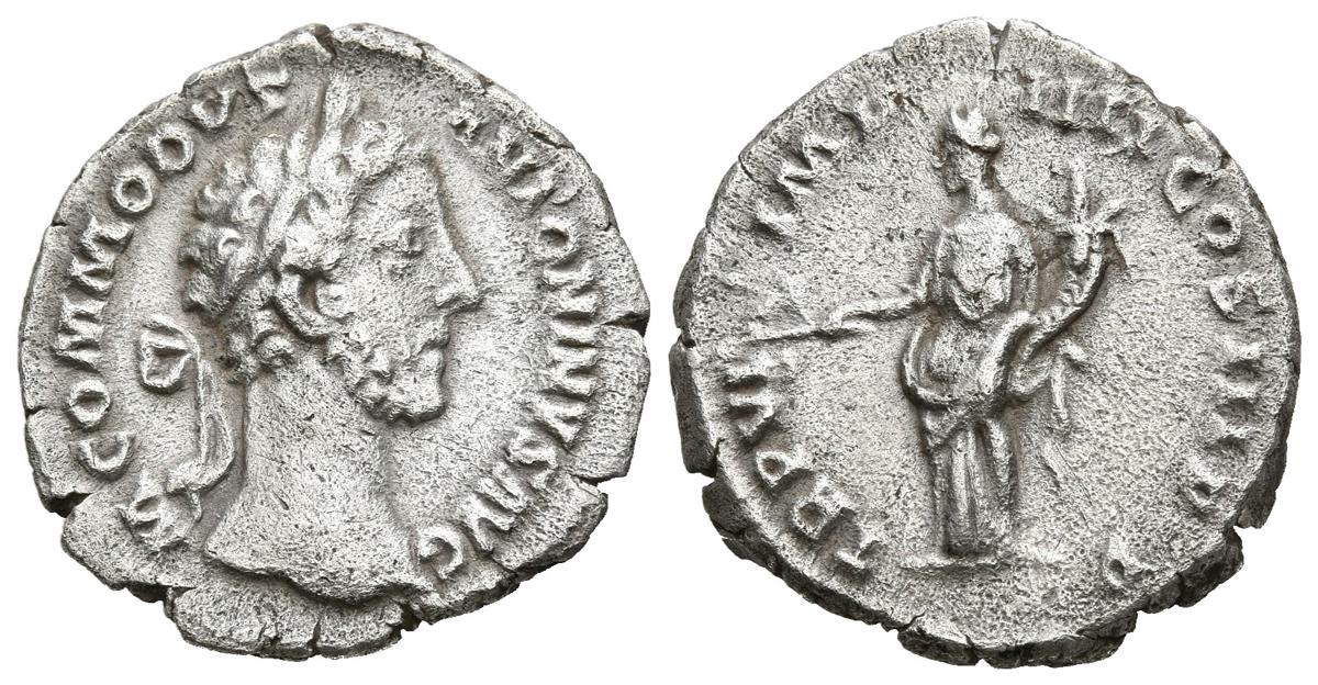 COMODO. Denario. (Ar. 3,32g/19mm). 181 d.C. Roma. (RIC 17). Anv: Cabeza laureada de Cómodo a derecha, alrededor leyenda: M COMMODVS ANTONINVS AVG. Rev: Pax estante a izquierda portando rama y cornucopia, alrededor leyenda: TR P VI IMP IIII COS III P P. MBC.