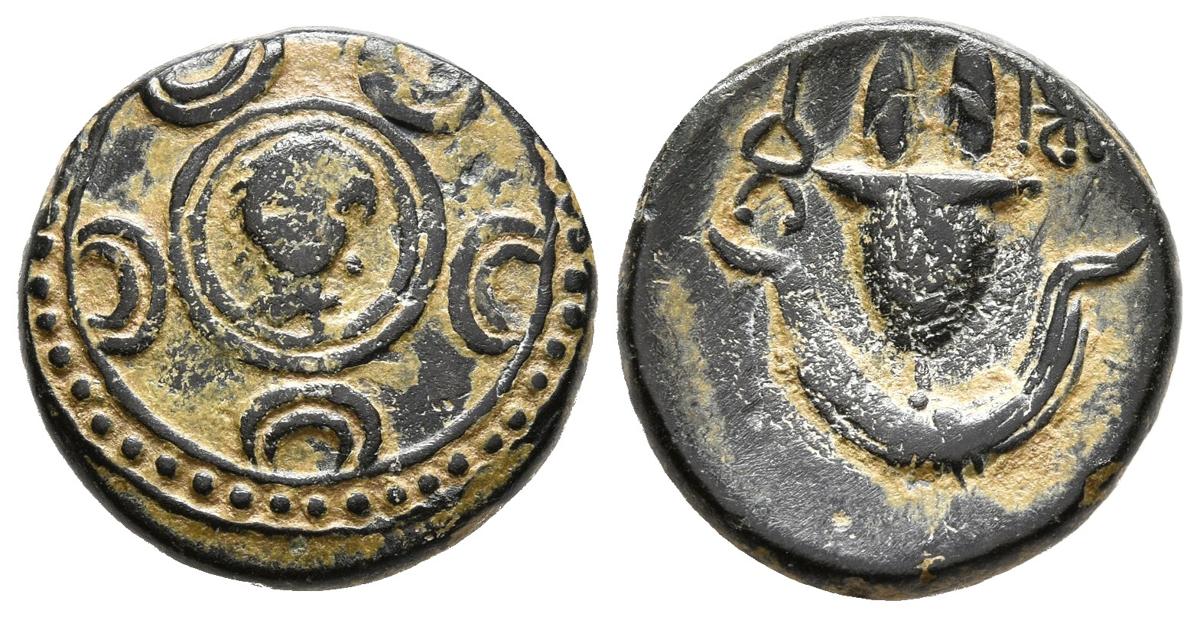REYES DE MACEDONIA, Filipo III Arrhidaios. Ae16. (Ae. 3,84g/16mm). 323-317 a.C. Ceca incierta del oeste de Asia. (Price 2803). Anv: Caebza de Heracles con piel de león a derecha dentro de escudo macedonio. Rev: Casco macedonio, a la izquierda monograma griego, a la derecha caduceo. MBC.