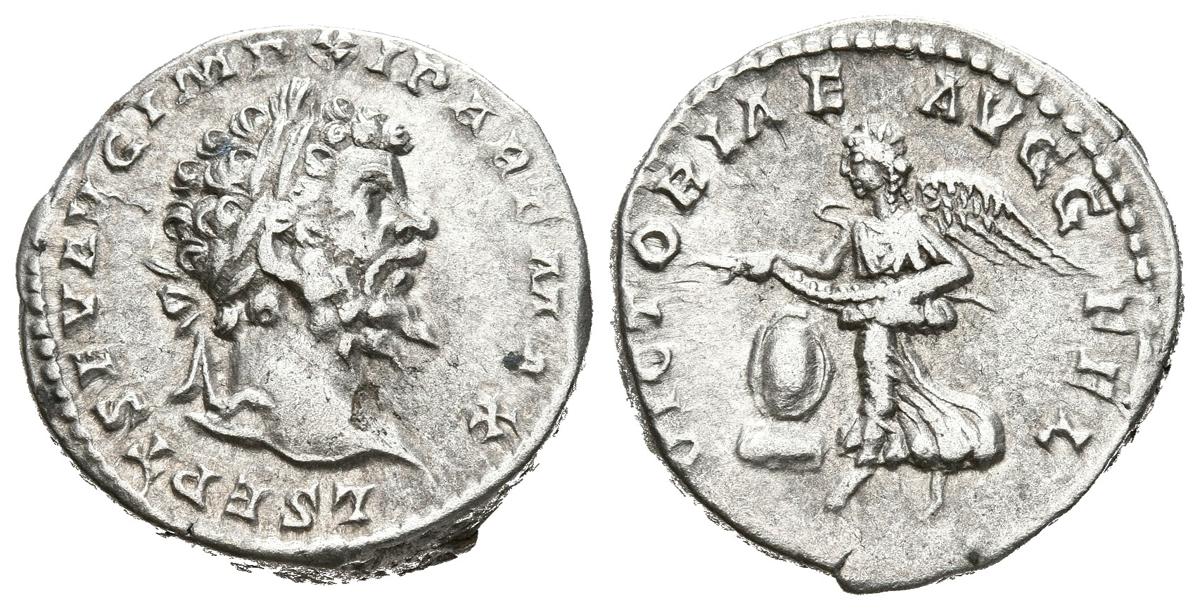 SEPTIMIO SEVERO. Denario. (Ar. 3,51g/18mm). 200 d.C. Roma. (RIC 200). Anv: Cabeza laureada de Septimio Severo a derecha, alrededor leyenda: L SEPT SEV AVG IMP XI PART MAX. Rev: Victoria avanzando a izquierda portando vara y escudo, alrededor leyenda: VICTORIAE AVGG FEL. MBC+.