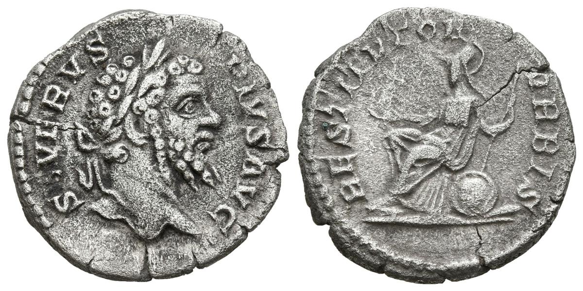 SEPTIMIO SEVERO. Denario. (Ar. 2,91g/19mm). 202-210 d.C. Roma. (RIC 288). Anv: Cabeza laureada de Septimio Severo a derecha, alrededor leyenda: SEVERVS PIVS AVG. Rev: Roma sentada a izquierda portando lanza y victoria, detrás escudo, alrededor leyenda: RESTITVTOR VRBIS. MBC. Oxidaciones limpiadas.