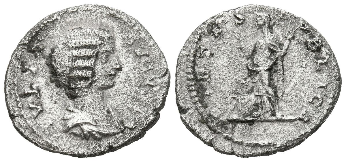 JULIA DOMNA. Denario. (Ar. 2,99g/19mm). 200-207 d.C. Roma. (RIC 574). Anv: Busto diademado y drapeado de Julia Domna a derecha, alrededor leyenda: IVLIA AVGVSTA. Rev: Pietas estante a izquierda portando patera sobre altar y alzando mano izquierda, alrededor leyenda: PIETAS PVBLICA. MBC-. Oxidaciones limpiadas.
