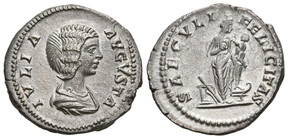 JULIA DOMNA. Denario. (Ar. 2,94g/20mm). 196-211 d.C. Roma. (RIC 577). Anv: Busto drapeado y diademado de Julia Domna a derecha, arlededor leyenda: IVLIA AVGVSTA. Rev: Isis estante a derecha con el pie sobre proa y Horus en sus brazos, detrás timón apoyado en altar, alrededor leyenda: SAECVLI FELICITAS. EBC. Precioso ejemplar.