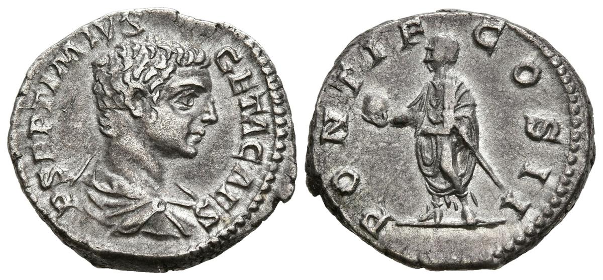 GETA. Denario. (Ar. 4,04g/19mm). 209 d.C. Roma. (RIC 61a). Anv: Busto drapeado y con coraza de Geta a derecha, alrededor leyenda: P SEPTIMIVS GETA CAES. Rev: Geta estante a izquierda portando globo y cetro, alrededor leyenda: PONTIF COS II. MBC+.