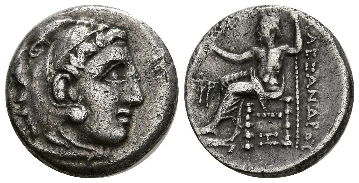 REYES DE MACEDONIA, Alejandro III el Grande. Dracma. (Ar. 4,04g/17mm). 310-301 a.C. Colofón. (Price 1534). Anv: Cabeza de Hércules a derecha con piel de león. Rev: Zeus sentado a izquierda portando cetro y águila, bajo trono H tumbada, delante monograma griego, detrás leyenda griega. MBC.