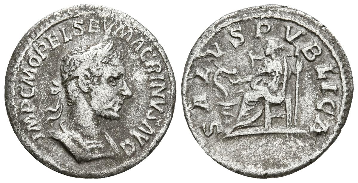 MACRINO. Denario. (Ar. 2,60g/20mm). 217-218 d.C. Roma. (RIC 86). Anv: busto laureado con coraza de Macrino a derecha, alrededor leyenda: IMP C M OPEL SEV MACRINVS AVG. Rev: Salus sentada a derecha portando patera y cetro, alrededor leyenda: SALVS PVBLICA. MBC-.