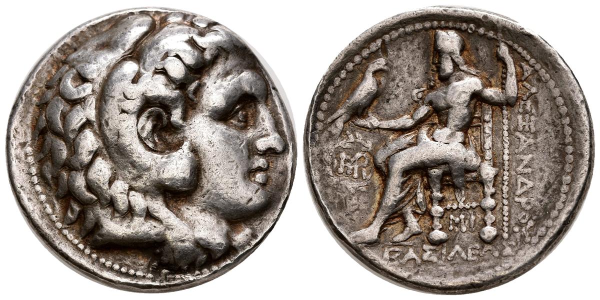 REYES DE MACEDONIA, Alejandro III el Grande. Tetradracma. (Ar. 16,77g/27mm). 311-300 a.C. Babilonia. (Price 3746). Anv: Cabeza de Hércules a derecha con piel de león. Rev: Zeus sentado a izquierda portando cetro y águila, debajo del trono: MI, delante monograma griego dentro de corona de laurel, alrededor leyenda griega. MBC.