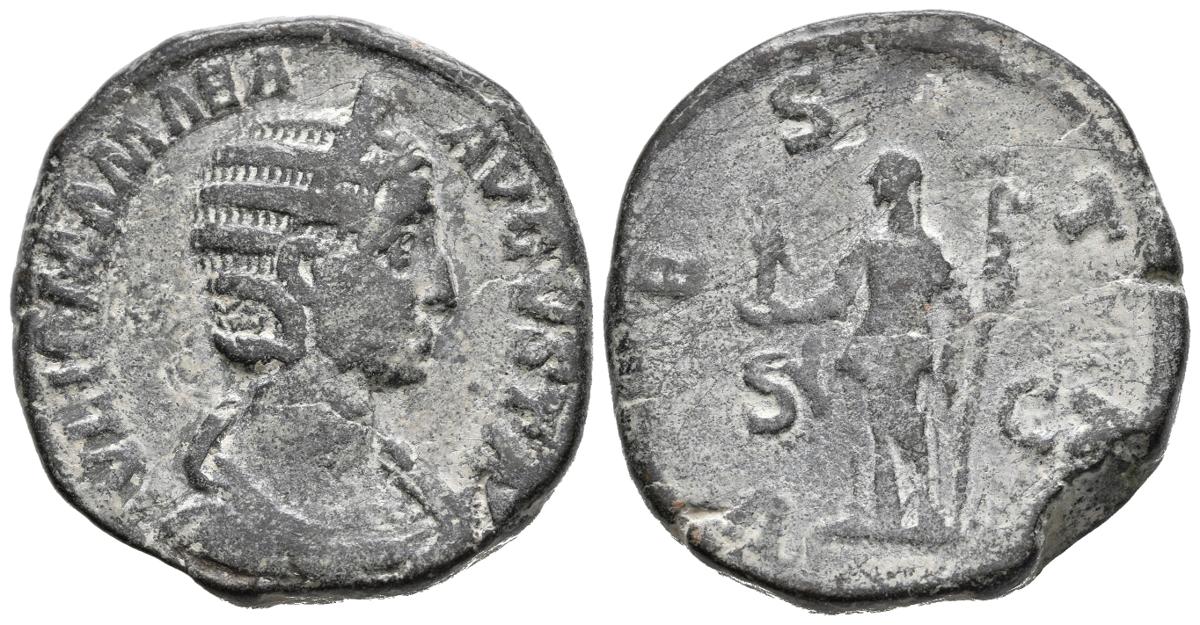 JULIA MAMAEA. Sestercio. (Ae. 19,96g/30mm). 222-235 d.C. Roma. (RIC 708). Anv: Busto diademado y drapeado de Julia Mamaea a derecha, alrededor leyenda: IVLIA MAMAEA AVGVSTA. Rev: Vesta estante a izquierda sosteniendo palladium y cetro, entre S-C, alrededor leyenda: VESTA. MBC-.