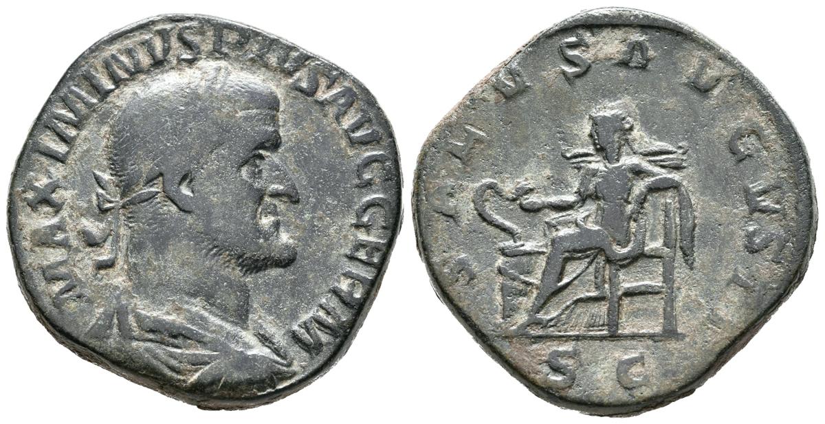 MAXIMINO I. Sestercio. (Ae. 21,77g/30mm). 235-236 d.C. Roma. (RIC 85). Anv: Busto lauread y drapeado de Maximino I a derecha, alrededor leyenda: MAXIMINVS PIVS AVG GERM. Rev: Salus sentada a izquierda alimentando a serpiente, debajo SC, alrededor leyenda: SALVS AVGVSTI. MBC.