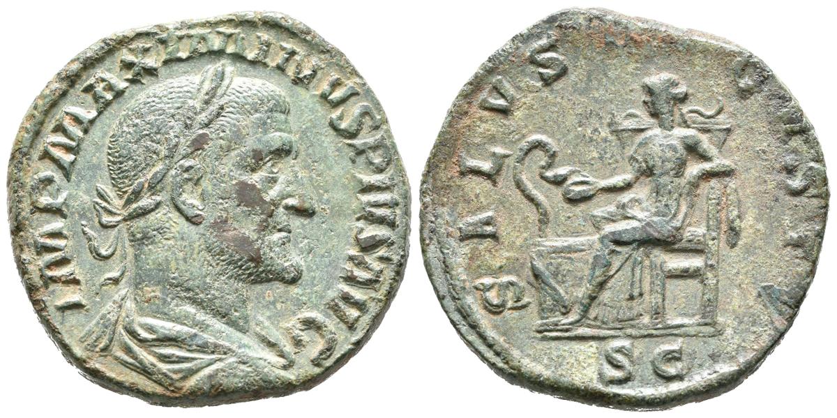 MAXIMINO I. Sestercio. (Ae. 18,87g/29mm). 235-236 d.C. Roma. (RIC 85). Anv: Busto lauread y drapeado de Maximino I a derecha, alrededor leyenda: MAXIMINVS PIVS AVG GERM. Rev: Salus sentada a izquierda alimentando a serpiente, debajo SC, alrededor leyenda: SALVS AVGVSTI. EBC-/MBC+. Pátina verde. Bonito ejemplar.