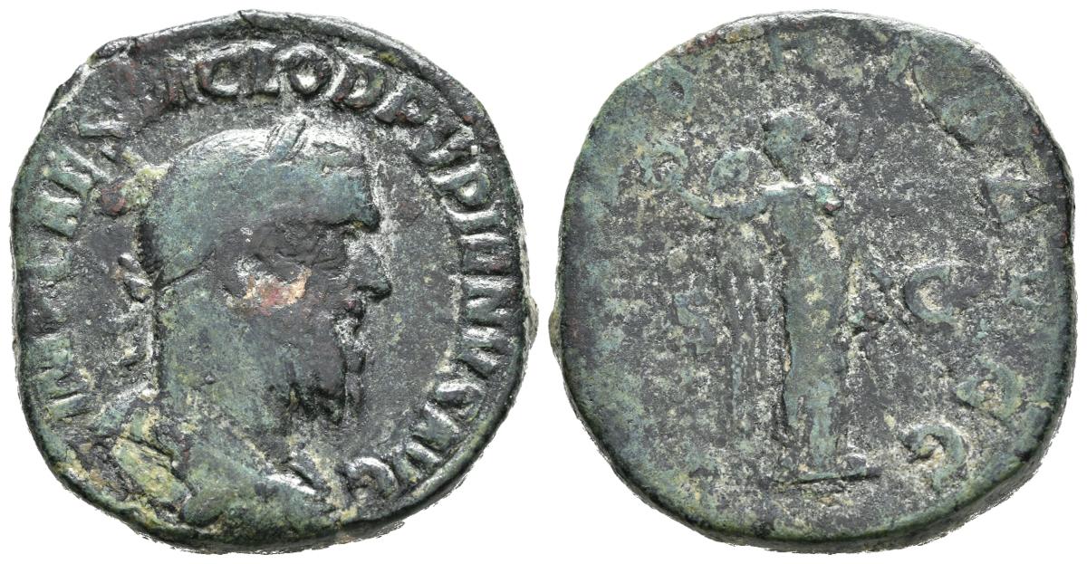 PUPIENO. Sestercio. (Ae. 20,06g/29mm). 238 d.C. Roma. (RIC 23a). Anv: Busto laureado, drapeado y con coraza de Pupieno a derecha, alrededor leyenda: IMP CAES M CLOD PVPIENVS AVG. Rev: Victoria estante a izquierda portando corona de laurel y palma, entre S-C, alrededor leyenda: VICTORIA AVGG. BC+.