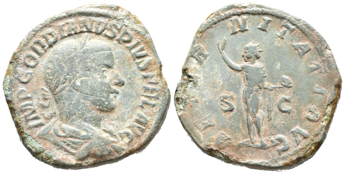 GORDIANO III. Sestercio. (Ae. 18,01g/33mm). 238-244 d.C. Roma. (RIC 297a). Anv: Busto laureado y drapeado de Gordiano III a derecha, alrededor leyenda: IMP GORDIANVS PIVS FEL AVG. Rev: Sol estante a izquierda alzando mano derecha y portando globo, entre S-C, alrededor leyenda: AETERNITATI AVG. MBC-. Pátina verde.