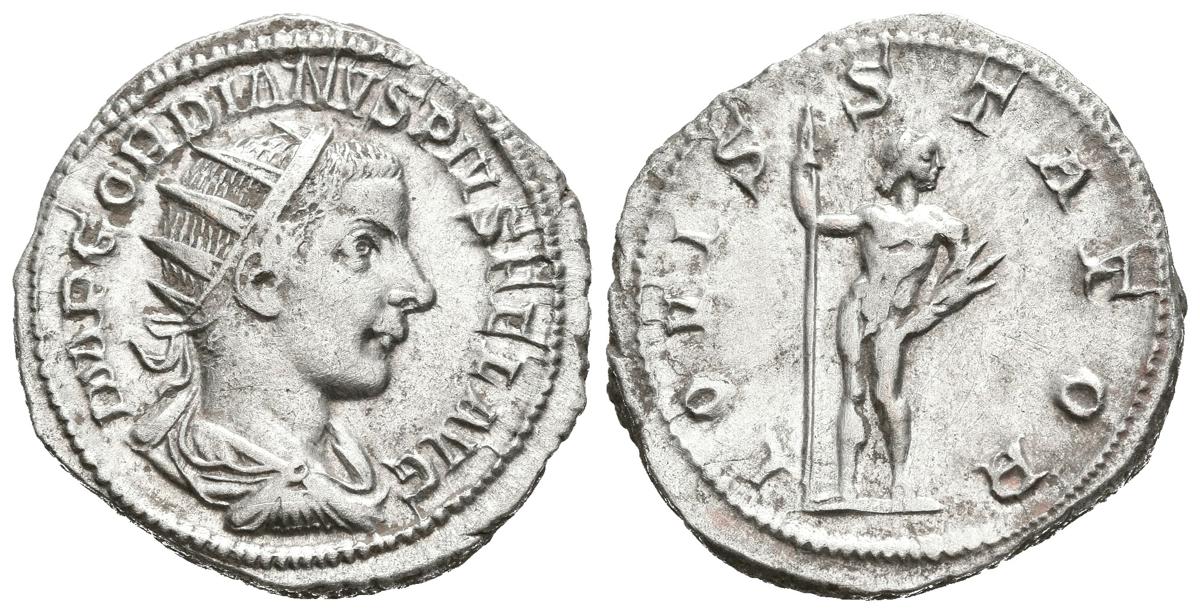 GORDIANO III. Antoniniano. (Ar. 4,30g/22mm). 240 d.C. Roma. (RIC 85). Anv: Busto radiado, drapeado y con coraza de Gordiano III a derecha, alrededor leyenda: IMP GORDIANVS PIVS FEL AVG. Rev: Júpiter estante a derecha portando lanza y haz de rayos, alrededor leyenda: IOVIS STATOR. MBC.