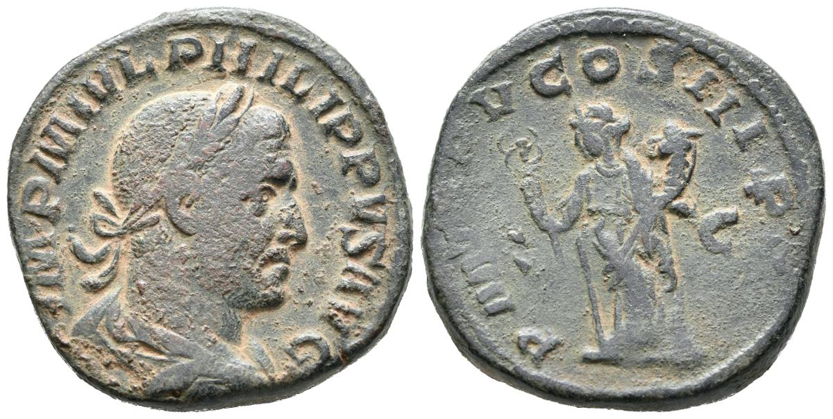 FILIPO I. Sestercio. (Ae. 21,10g/29mm). 247 d.C. Roma. (RIC 149a). Anv: Busto laureado y drapeado de Filipo I a derecha, alrededor leyenda: IMP M IVL PHILIPPVS AVG. Rev: Felicitas estante a izquierda portando caduceo y cornucopia, entre: S-C, alrededor leyenda: P M TR P V COS III P P. MBC.