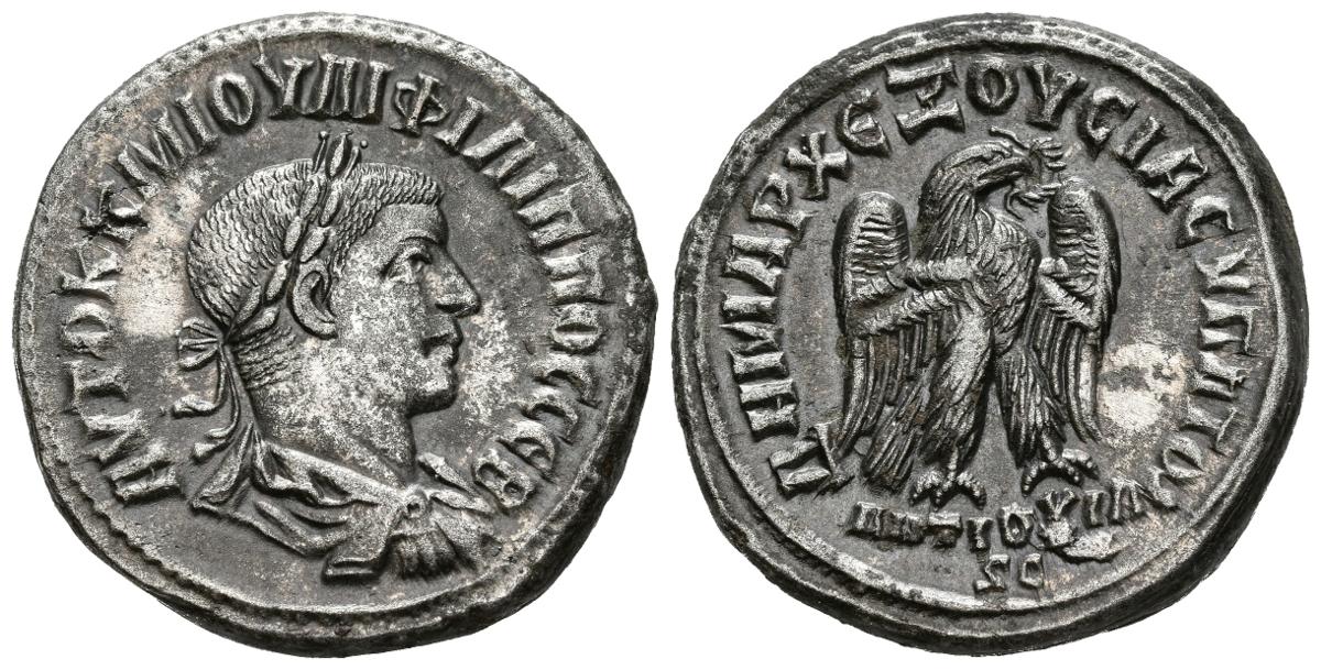 FILIPO II. Tetradracma. (Ar. 12,47g/26mm). 247-249 d.C. Seleucis y Pierria. (McAlee 1042). Anv: Busto laureado, drapeado y con coraza de Filipo II a derecha, alrededor leyena griega. Rev: Aguila estante a derecha con corona de laurel en el pico, debajo leyenda: ANTIOXIA/SC, alrededor leyenda griega. EBC+. Precioso ejemplar.