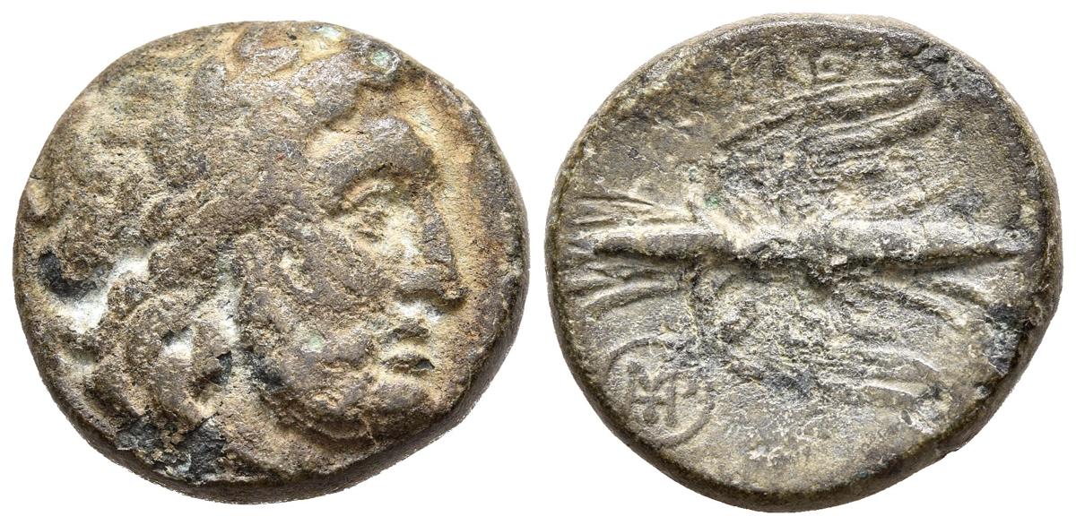 SELEUKIS Y PIERIA. Ae19. (Ae. 6,50g/19mm). Siglo II-Siglo I a.C. (SNG Copenhagen 388-390). Anv: Cabeza laureada de Zeus a derecha. Rev: Rayo alado, debajo monograma, encima leyenda griega. MBC.