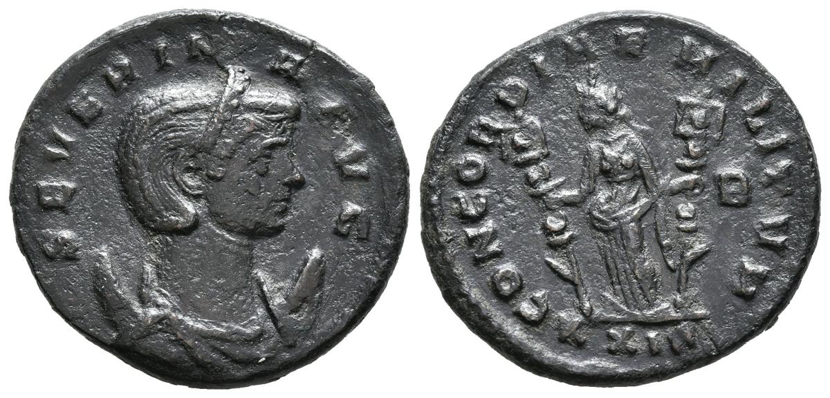 SEVERINA. Antoniniano. (Ae. 3,86g/21mm). 270-275 d.C. Roma. (RIC 4). Anv: SEVERINA AVG. Busto diademado y drapeado de Severina a derecha sobre creciente. Rev: Concordia estante a izquierda portando dos estandartes, detrás B, en exergo XXIR, alrededor leyenda: CONCORDIAE MILITVM. MBC. Pátina artificial.