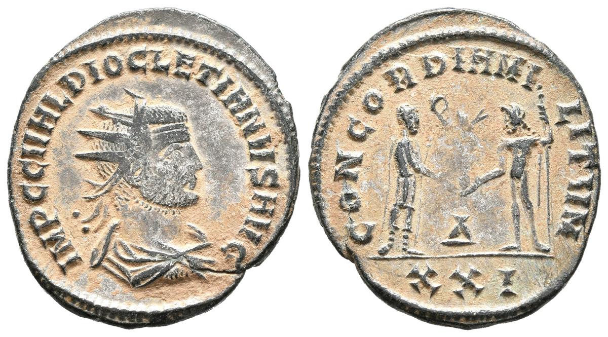 DIOCLECIANO. Antoniniano. (Ae. 3,06g/22mm). 290-291 d.C: Heráclea. (RIC 284). Anv: Busto radiado, drapeado y con coraza de Diocleciano a derecha, alrededor leyenda: IMP CC VAL DIOCLETIANVS PF AVG. Rev: Júpiter estante a derecha ofreciendo Victoria con corona de laurel a Diocleciano, entre ellos A, en exergo: XXI, alrededor leyenda: CONCORDIA MILITVM. MBC.