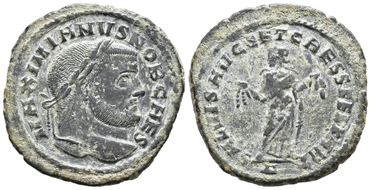 GALERIO MAXIMIANO. Follis. (Ae. 7,70g/28mm). 299-303 d.C. Cártago. (RIC 30b). Anv: Cabeza laureada de Galerio Maximiano a derecha, alrededor leyenda: MAXIMIANVS NOB CAES. Rev: Cártago estante a izquierda portando espigas, en exergo: A, alrededor leyenda: SALVIS AVGG ET CAESS FEL KART. MBC+.