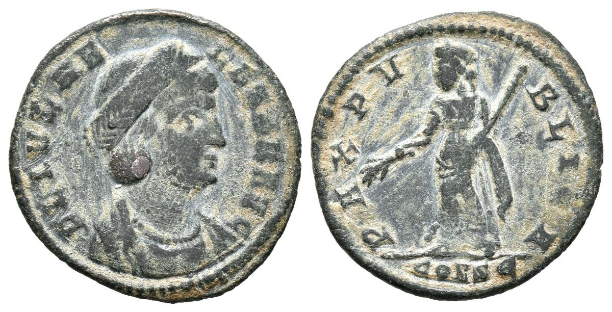 HELENA. Centenional. (Ae. 1,19g/17mm). 330 d.C. Constantinopla. (RIC 33). Anv: Busto diademado, drapeado y con coraza de Helena a derecha, alrededor leyenda: FL IVL HELENAE AVG. Rev: Pax estante a izquierda portando rama y cetro, en exergo: CONSE, alrededor leyenda: PAX PVBLICA. MBC.