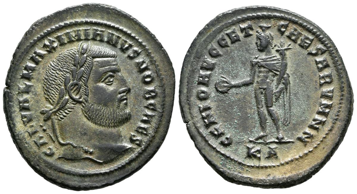 GALERIO. Follis. (Ae. 9,97g/26mm). 295-296 d.C. Cícico. (RIC 9b). Anv: Cabeza laureada de Galerio a derecha, alrededor leyenda: GAL VAL MAXIMIANVS NOB CAES. Rev: Genio estante a izquierda portando patera y cornucopia con drapeado, en exergo: KA, alrededor leyenda: GENIO AVGG ET CAESARVM NN. EBC. Precioso ejemplar con un gran flan, escaso así.