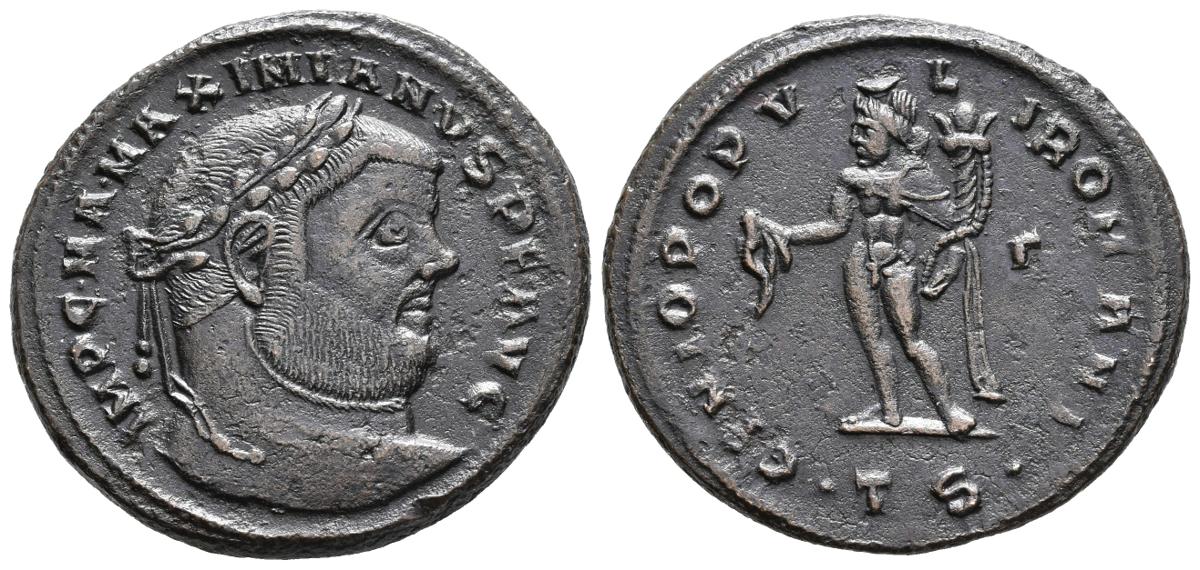 MAXIMIANO. Follis. (Ae. 8,89g/28mm). 302-303 d.C. Tesalónica. (RIC 25b). Anv: Cabeza laureada de Galerio a derecha, alrededor leyenda: IMP C M A MAXIMIANVS P F AVG. Rev: Genio estante a izquierda portando patera y cornucopia, en campo r, en exergo: TS, alrededor leyenda: GENIO POPVLI ROMANI. EBC. Pátina artificial.