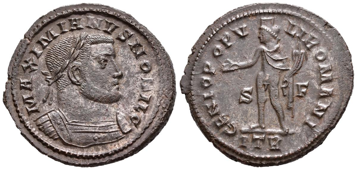 GALERIO. Follis. (Ae. 10,51g/30mm). 302-303 d.C. Trier. (RIC 530b). Anv: Busto laureado y con coraza de Galerio a derecha, alrededor leyenda: MAXIMIANVS NOBIL C. Rev: Genio estante a izquierda portando patera y cornucopia con drapeado, entre S-F, en exergo: ITR, alrededor leyenda: GENIO POPVLI ROMANI. EBC+. Precioso ejemplar, escaso así.