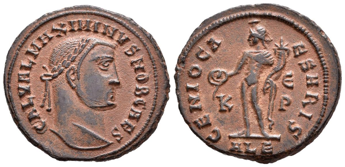 MAXIMINO II. Follis. (Ae. 6,34g/25mm). 308-309 d.C. Alejandría. (RIC 100a). Anv: Cabeza laureada de Maximino II a derecha, alrededor leyenda: GAL VAL MAXIMINVS NOB CAES. Rev: Genio estante a izquierda portando patera y cornucopia, en campo: E/K-P, en exergo: ALE, alrededor leyenda: GENIO CAESARIS. EBC-.