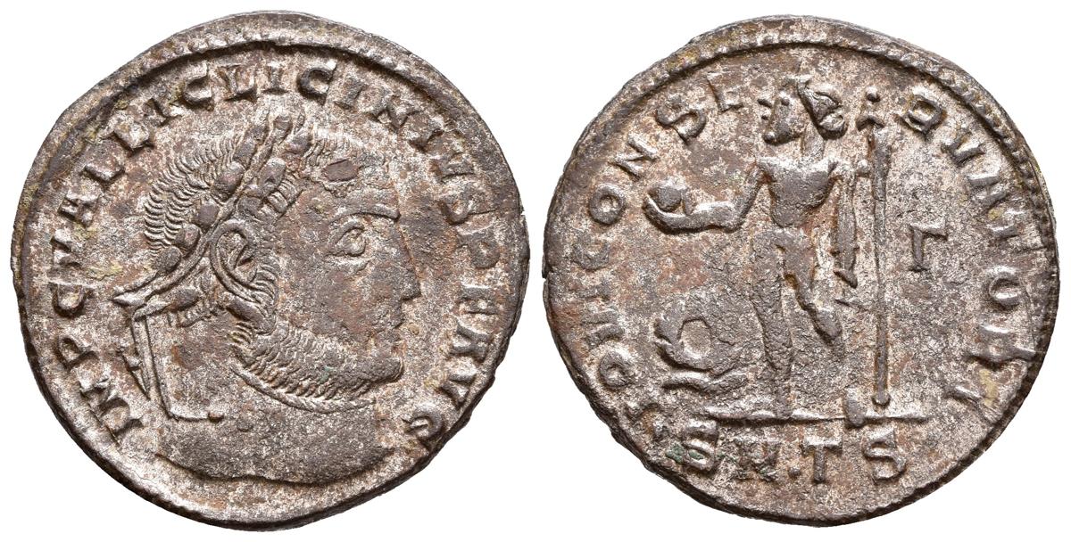 LICINIO I. Follis. (Ae. 4,90g/24mm). 312 d.C. Tesalónica. (RIC 49). Anv: Cabeza laureada de Licinio I a derecha, alrededor leyenda: IMP C VAL LIC LICINIVS PF AVG. Rev: Júpiter estante a izquierda portando globo y cetro, en campo: r, a sus pies corona de laurel, en exergo: SMTS, alrededor leyenda: IOVI CONSERVATORI. MBC+. Restos de plateado original.