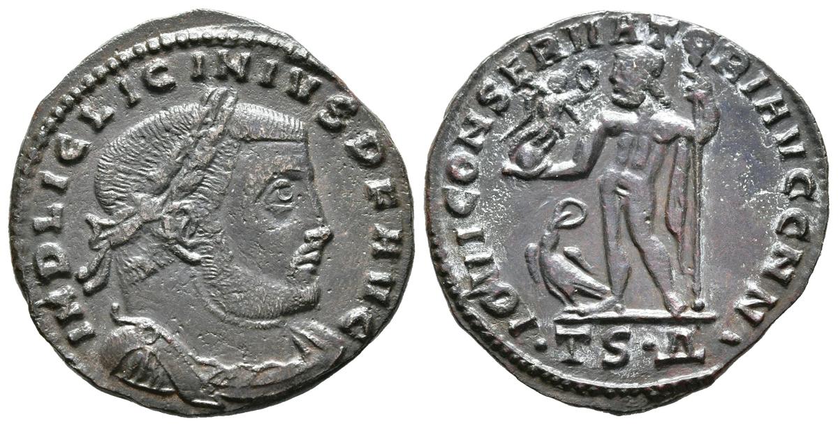 LICINIO I. Follis. (Ae. 3,76g/23mm). 312-313 d.C. Tesalónica. (RIC 59). Anv: Busto laureado y con coraza de Licinio I a derecha, alrededor leyenda: IMP LIC LICINIVS P F AVG. Rev: Júpiter estante a izquierda portando cetro y Victoria con corona de laurel, a sus pies águila con corona de laurel, en exergo: TSA, alrededor leyenda: IOVI CONSERVATORI AVGG NN. MBC+.