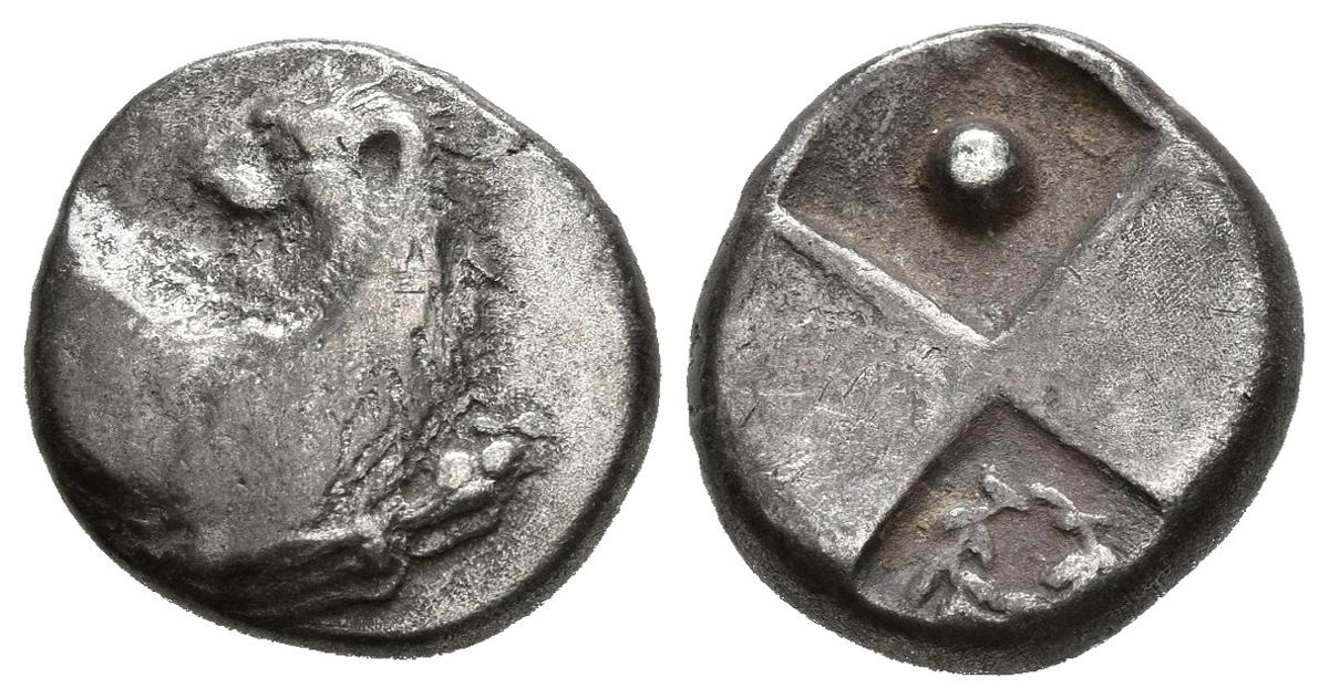 TRACIA, Chersonesos. Hemidracma. (Ar. 2,27g/13mm). 400-350 a.C. (Seaby 1607). Anv: Parte delantera de león a izquierda. Rev: Cuatripartito incuso con punto en primer cuadrante y corona de laurel en el cuarto cuadrante. MBC-.
