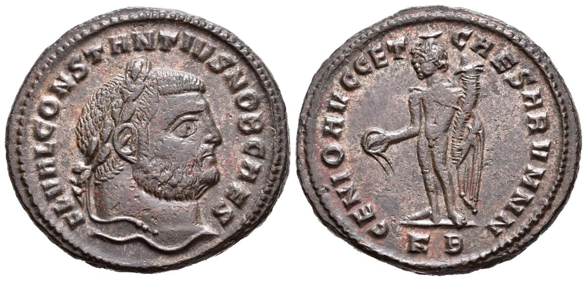 CONSTANCIO I. Follis. (Ae. 10,06g/28mm). 294-295 d.C. Cícico. (RIC 7a). Anv: Cabeza laureada de Constantino I a derecha, alrededor leyenda: FL VAL CONSTANTIVS NOB CAES. Rev: Genio estante a izquierda portando patera y cornucopia con drapeado, en exergo: KB, alrededor leyenda: GENIO AVGG ET CAESARVM NN. EBC. Bonito ejemplar.