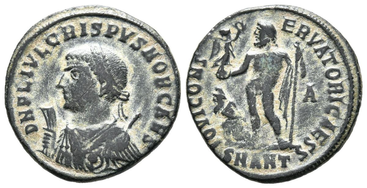 CRISPO. Follis. (Ae. 2,68g/19mm). 317-318 d.C. Antioquía. (RIC 28). Anv: Busto laureado, drapeado y con coraza portando mappa, globo y cetro, alrededor leyenda: D N FL IVL CRISPVS NOB CAES. Rev: Júpiter estante a izquierda portando Victoria con corona de laurel y cetro, a sus pies cautivo, en campo A, en exergo: SMANT, alrededor leyenda: IOVI CONSERVATORI CAESS. MBC.