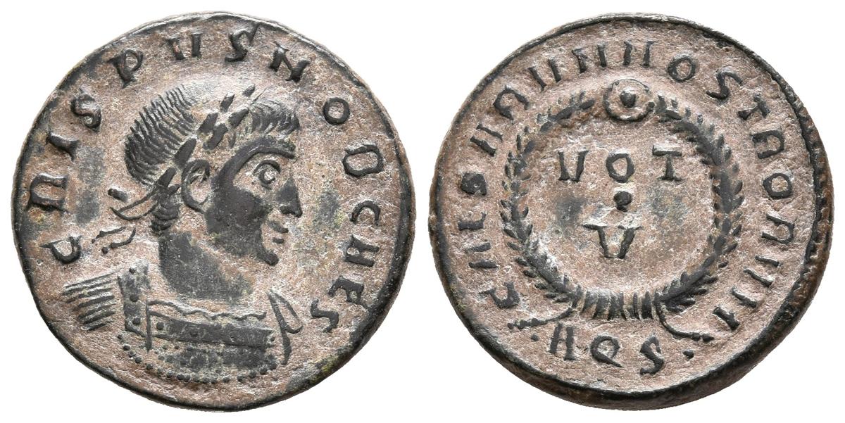 CRISPO. Follis. (Ae. 3,09g/18mm). 321 d.C. Aquileia. (RIC 87). Anv: Busto laureado, drapeado y con coraza de Crispo a derecha, alrededor leyenda: CRISPVS NOB CAES. Rev: Leyenda: VOT/V, dentro de láurea, alrededor leyenda: CAESARVM NASTRORVM, debajo: AQS. MBC.