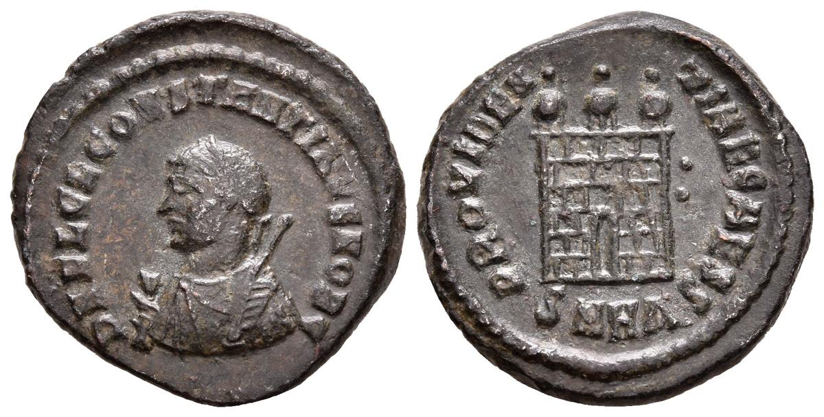 CONSTANTINO II. Follis. (Ae. 3,46g/19mm). 318-320 d.C. Heráclea. (RIC 46). Anv: Busto laureado, drapeado y con coraza de Constantino II a izquierda portando mappa, globo y cetro, alrededor leyenda: D N FL CL CONSTANTINVS NOB C. Rev: Puerta de campamento con tres torretas encima, debajo: SMHA, alrededor leyenda: PROVIDENTIAE CAESS. MBC+.