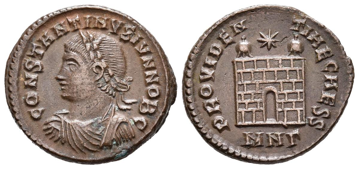 CONSTANTINO II. Follis. (Ae. 3,01g/19mm). 325-326 d.C. Nicomedia. (RIC 123). Anv: Busto diademado y drapeado de Constantino II a izquierda portando leyenda: CONSTANTINVS IVN NOB C. Rev: Puerta de campamento con dos torretas encima, encima estrella, debajo: MNr, alrededor leyenda: PROVIDENTIAE CAESS. EBC-.