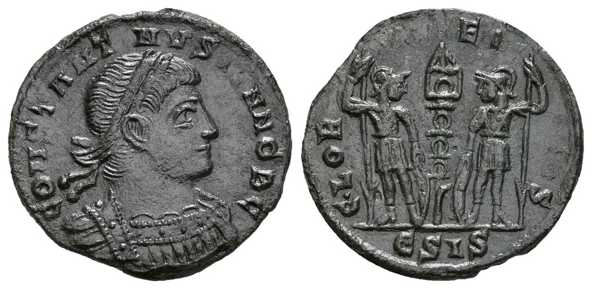 CONSTANTINO II. Follis. (Ae. 1,54g/17mm). 330-333 d.C. Siscia. (RIC 262). Anv: Busto diademado con coraza de Constantino II a derecha, alrededor leyenda: CONSTANTINVS IVN NOB C. Rev: Dos soldados estantes enfrentados portando lanzas, entre ellos estandarte, en exergo: ESIS, alrededor leyenda: GLORIAE EXERCITVS. EBC-. Vanos de acuñación.