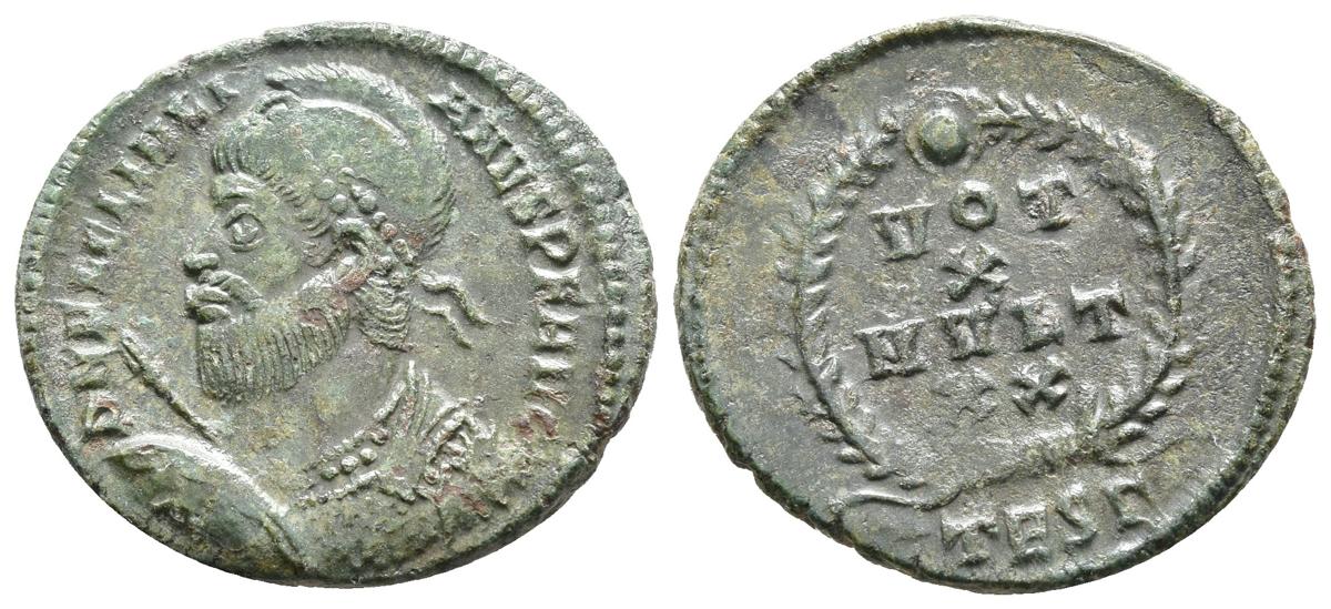 JULIANO II. Follis. (Ae. 3,08g/21mm). 361-363 d.C. Tesalónica. (RIC 227). Anv: Busto con casco y coraza de Juliano II a izquierda portando lanza y escudo, alrededor leyenda: DN FL CL IVLIANVS PF AVG. Rev: Leyenda: VOT/X/MVLT/XX, dentro de corona de laurel, debajo: TESr, entre dos ramas de laurel. MBC+. Bonita pátina verde.