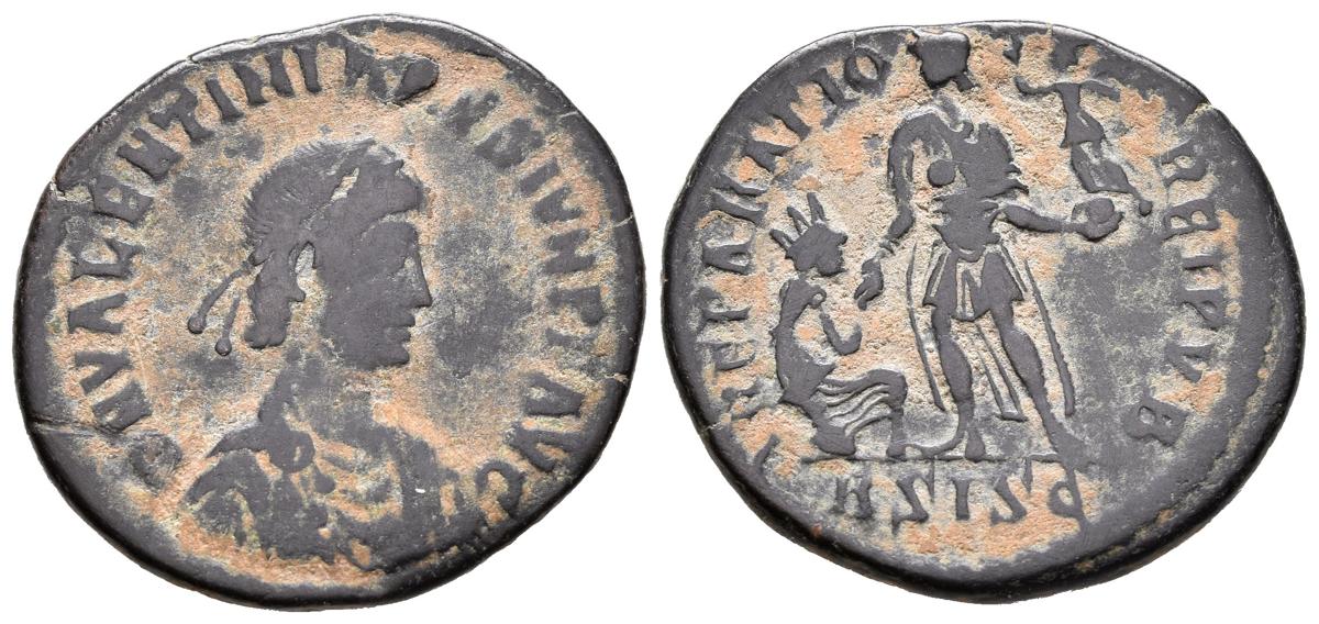 VALENTINIANO II. Maiorina. (Ae. 5,17g/25mm). 378-383 d.C. Siscia. (RIC 26b,2). Anv: Busto diademado, drapeado y con coraza de Valentiniano II a derecha, alrededor leyenda: DN VALENTINIANVS IVN PF AVG. Rev: Valentiniano estante a izquierda portando Victoria con corona de laurel dando la mano a mujer arrodillada a sus pies, en exergo: ASISC, alrededor leyenda: REPARATIO REI PVB. BC+.