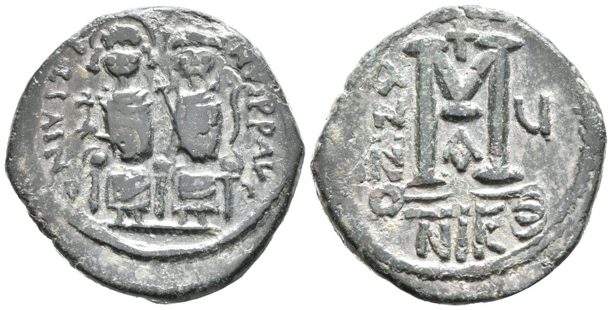 JUSTINO II y SOFIA. Follis. (Ae. 13,65g/30mm). 565-578 d.C. Nicomedia. (Seaby 369). Anv: Justino II y Sofia sentados de frente. Rev: M grande, encima cruz latina, debajo: NIKO. MBC-.