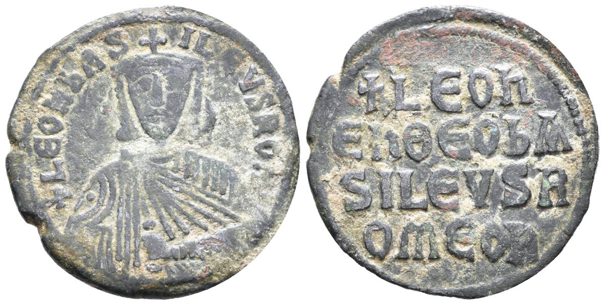 LEON IV. Follis. (Ae. 5,74g/32mm). 780-787 d.C. Constantinopla. (Seaby 1729). Anv: Busto coronado y drapeado de León IV portando cetro, alrededor leyenda. Rev: Leyenda en cuatro líneas. MBC-.
