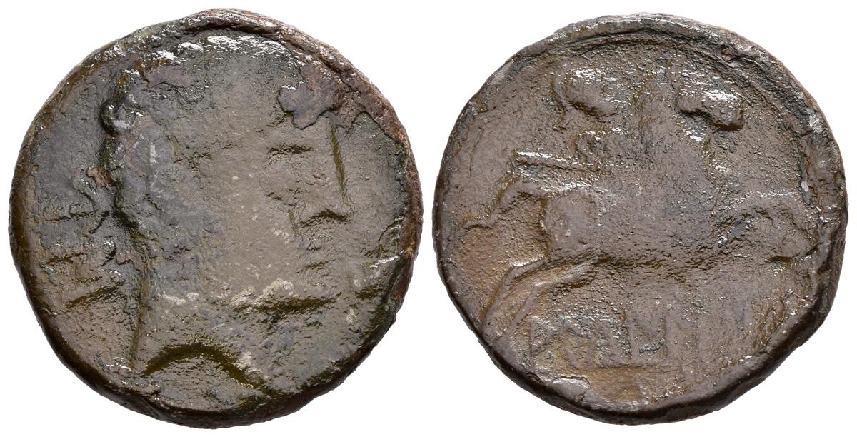 ARCAILICOS (Zonia de Soria-Guadalajara). As. (Ae. 9,98g/25mm). 120-80 a.C. (FAB-71). Anv: Cabeza masculina a derecha, delante delfín, detrás letras ibérica: US. Rev: Jinete con lanza a derecha, debajo leyenda ibérica. ARCaILICoS. BC-.