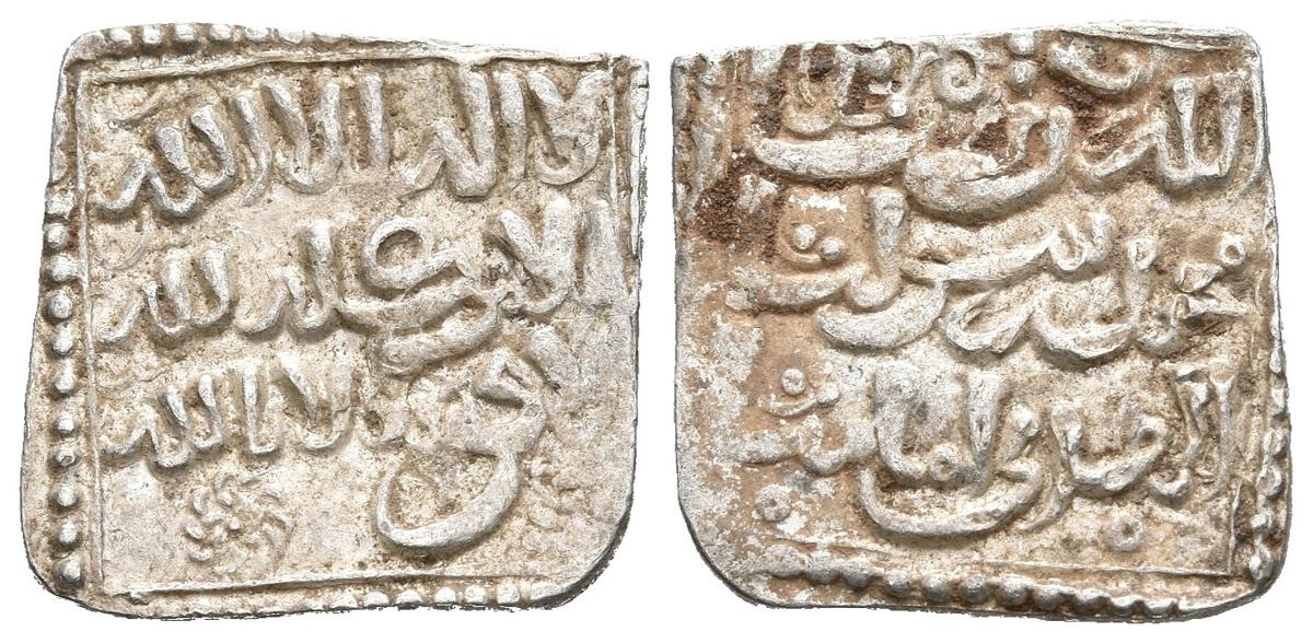 ALMOHADES, Anónimo en nombre de al-Mahdi. Dirham. (Ar. 1,55g/15mm). Sin ceca. (Vives 2088; Hazard 1101). Dos símbolos florales debajo. EBC. Restos de brillo original.