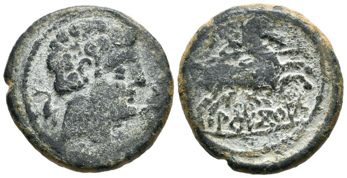 ARECORATAS (Agreda, Soria). As. (Ae. 9,12g/25mm). 150-20 a.C. (FAB-116). Anv: Cabeza masculina a derecha, entre dos delfines. Rev: Jinete con lanza a derecha, debajo leyenda ibérica: ARECoATaS. MBC-.