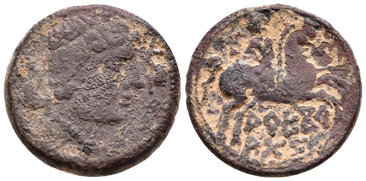 ARECORATAS (Agreda, Soria). As. (Ae. 9,71g/23mm). 150-20 a.C. (FAB-119). Anv: Cabeza masculina a derecha, entre dos delfines. Rev: Jinete con lanza a derecha, debajo leyenda ibérica en dos líneas: ARECo/ATaS. MBC-.