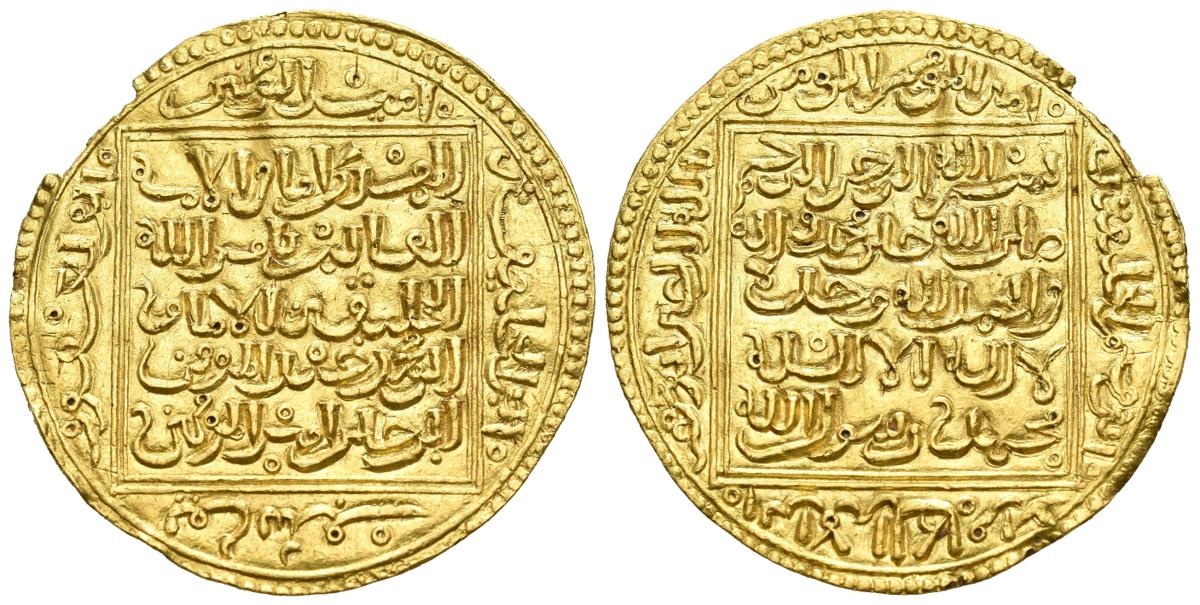 ALMOHADES, Abu Hafs Omar al-Murtada. Dobla. (Au. 4,59g/30mm). 646-665H. Sin ceca. (Vives 2080; Hazard 533). EBC+. Raro ejemplar, y más en esta preciosa calidad. Cospel ligeramente faltado