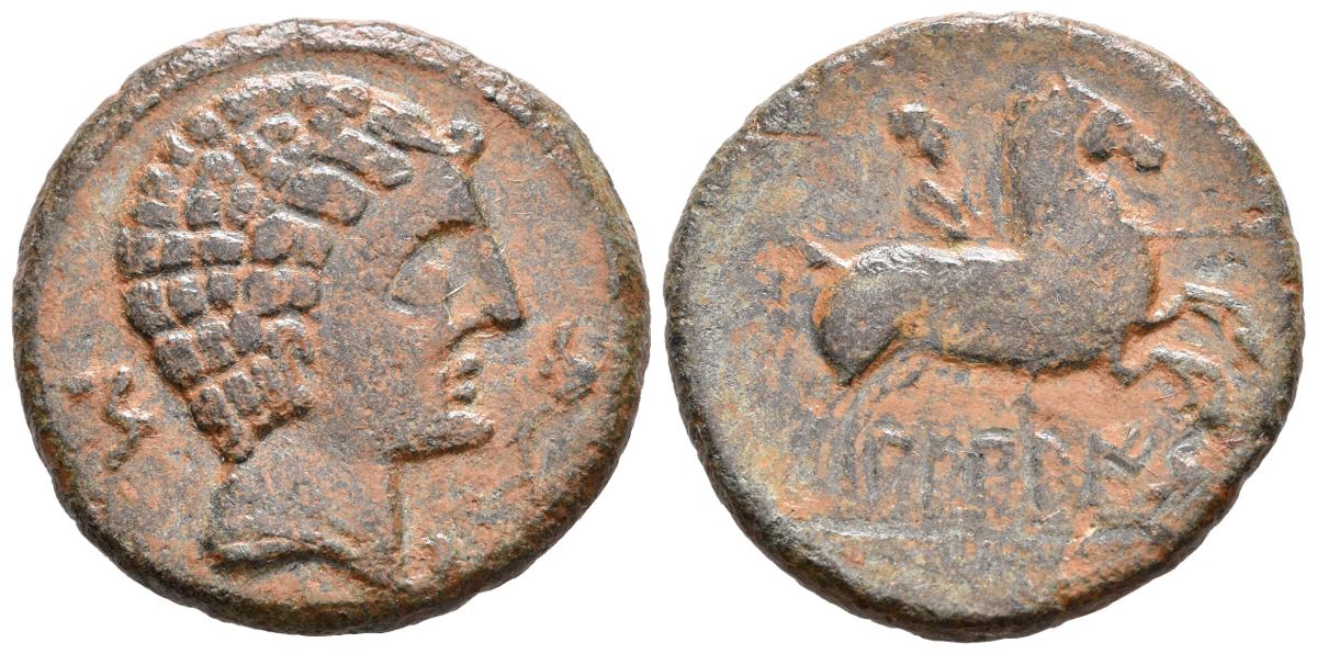BILBILIS (Calatayud, Zaragoza). As. (Ae. 10,42g/27mm). 120-30 a.C. (FAB-254). Anv: Cabeza masculina a derecha, detrás letra S, delante delfín. Rev: Jinete con lanza a derecha, debajo leyenda ibérica sobre línea: BILBILIS. MBC+/MBC.